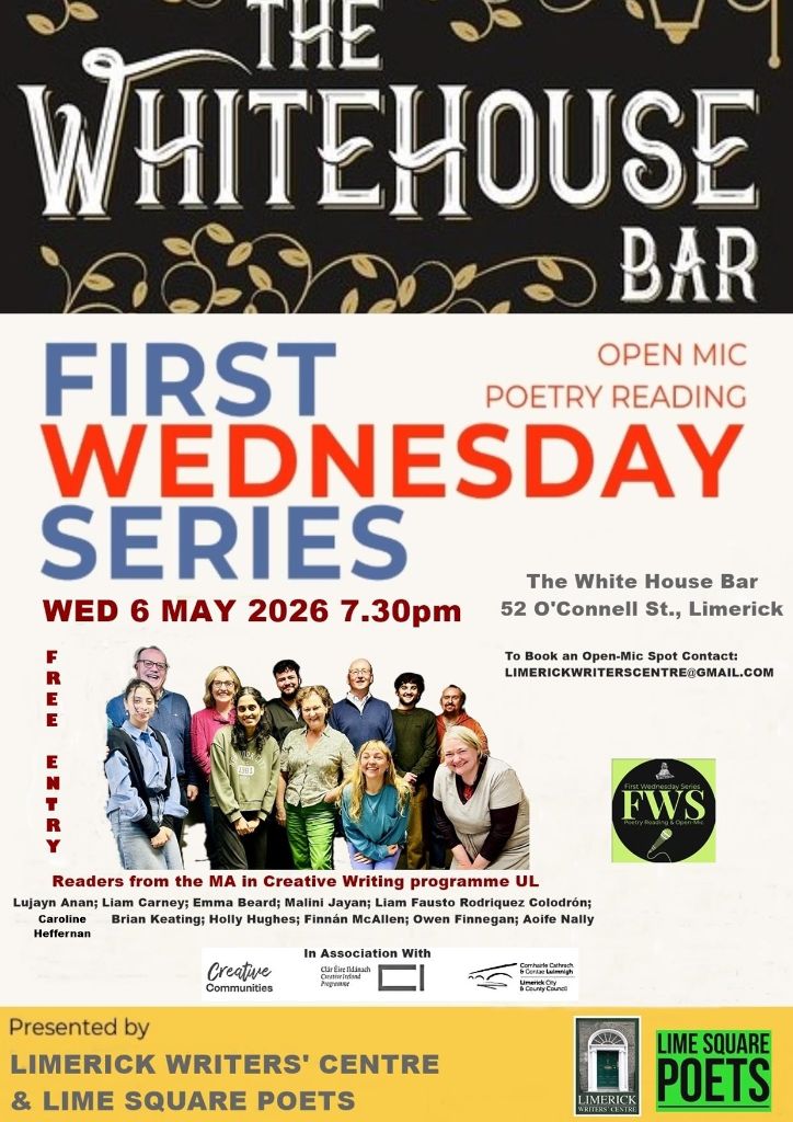 We’re back at The White House Bar on May 6th for another great night of poetry, featuring a guest reader from the MA in Creative Writing programme at UL, followed as always by our welcoming open‑mic.